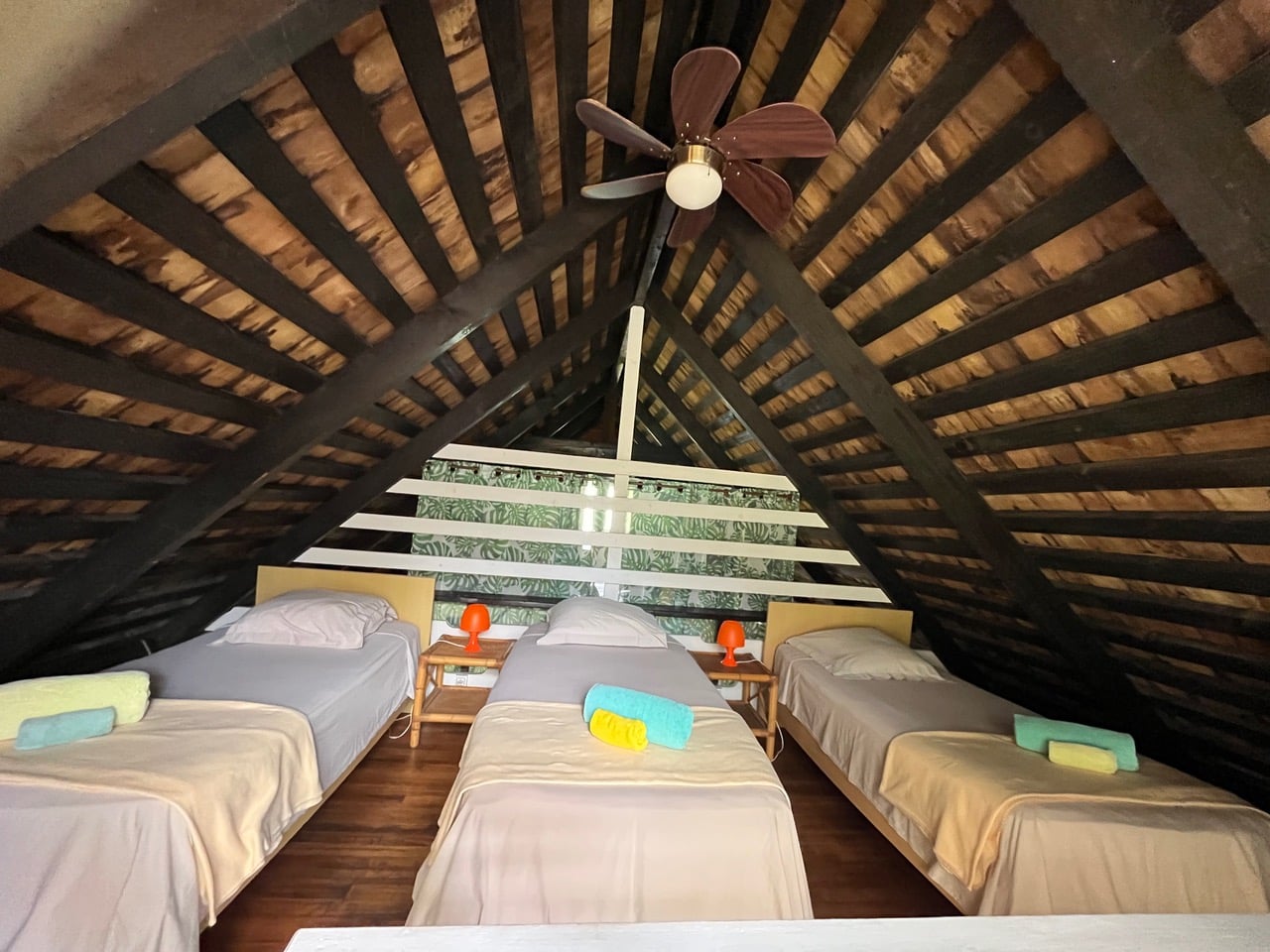 On the ground floor, there is a corridor with a wardrobe, a large kitchen, a living room with a fan and an air-conditioned bedroom (160 x 200 bed). On the first floor, there are 3 single beds (90 × 190) spread over a mezzanine floor with a fan and an air-conditioned bedroom with a double bed (160 × 200).