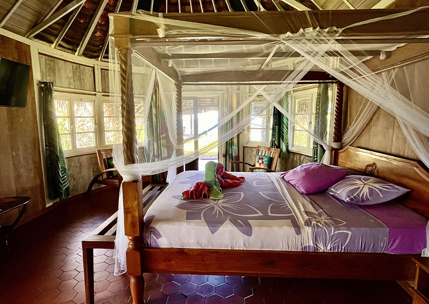 D’une surface confortable de 50 m², ce petit « fare » se démarque par son originalité. Climatiseur, brasseur d’air et téléviseur (chaînes françaises uniquement) lui donnent la touche contemporaine nécessaire pour un séjour des plus confortables. Un coffre-fort est aménagé dans le placard mural. Laissez-y vos documents et objets précieux.