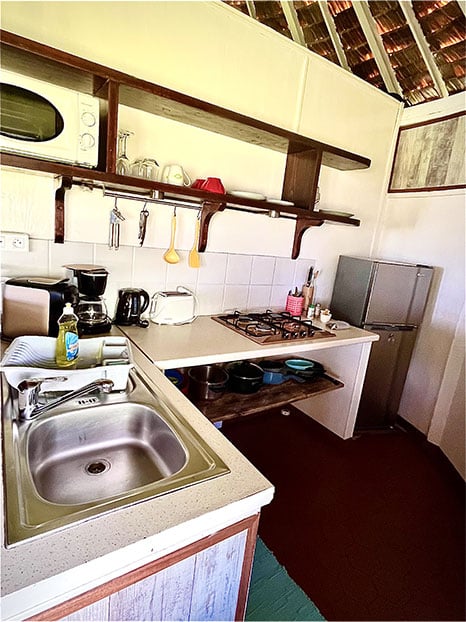 Le coin cuisine, séparé de la chambre, est équipé de vaisselle et couverts, ustensiles de cuisine, réfrigérateur, plaque de cuisson gaz 4 feux, four micro-ondes, cafetière électrique, grille-pain et bouilloire électrique. Torchon de cuisine, produit vaisselle, sel et poivre sont également fournis.
