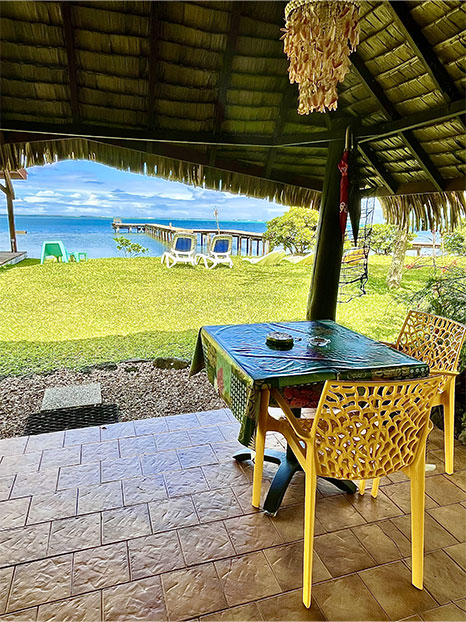 La petite terrasse couverte est agrémentée d’un hamac, table et chaises. Vous y prendrez vos repas avec vue sur la mer. Le bord de plage est à 5 mètres !