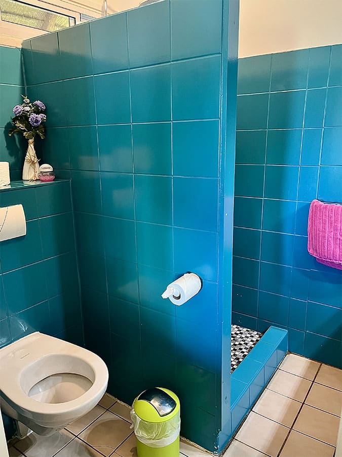 La salle de bain, dispose entre autres d’une douche à l’italienne avec eau chaude, vasque encastrée et toilettes suspendues. La production d’eau chaude est assurée par un brûleur au gaz installé à l’arrière et à l’extérieur du bungalow.