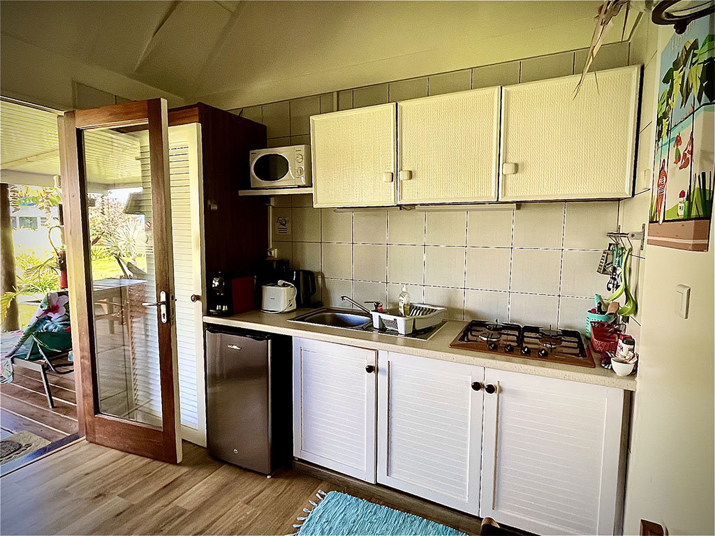 Ce studio, sans vis-à-vis, avec pour décor le bassin d’agrément planté de nénuphars, papyrus et dans lequel foisonnent les tilapias, vous offre depuis sa terrasse une vue sur le récif corallien, le « fare pote’e » en bord de plage et quelques parterres de fleurs. Nous nous ferons un plaisir de vous faire découvrir la grande variété de plantes et fruits qui agrémentent notre jardin.