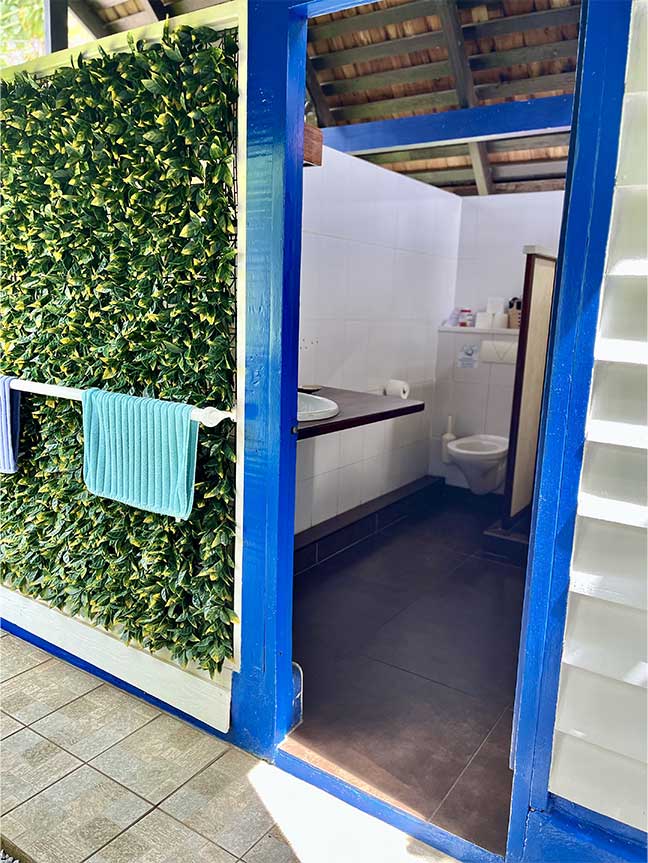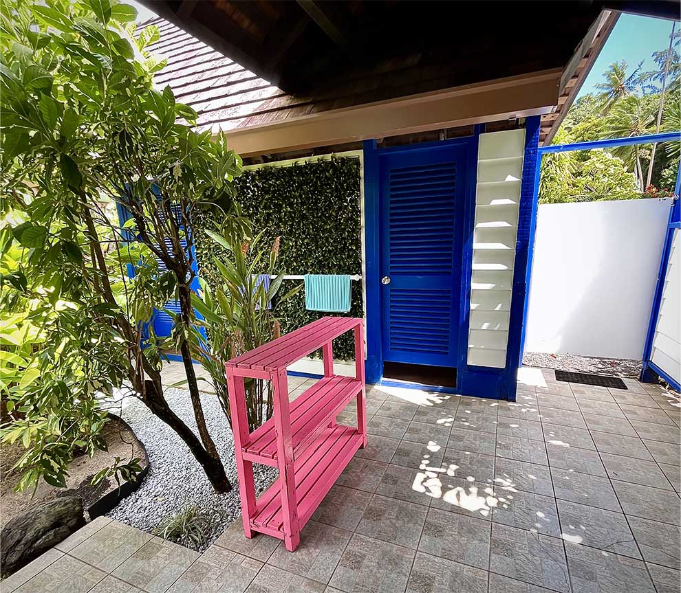 Les deux salles de bain privées sont aménagées dans un petit « fare » attenant, relié par une coursive en bardeaux à l’entrée principale de la villa. Elles disposent de douches italiennes, doubles vasques encastrées et de toilettes suspendues. La production d’eau chaude est assurée par un chauffe-eau solaire.
