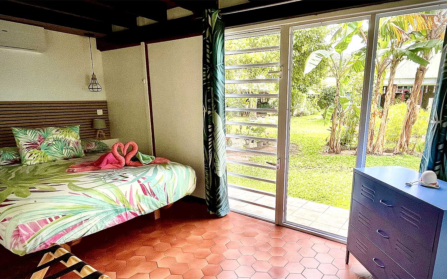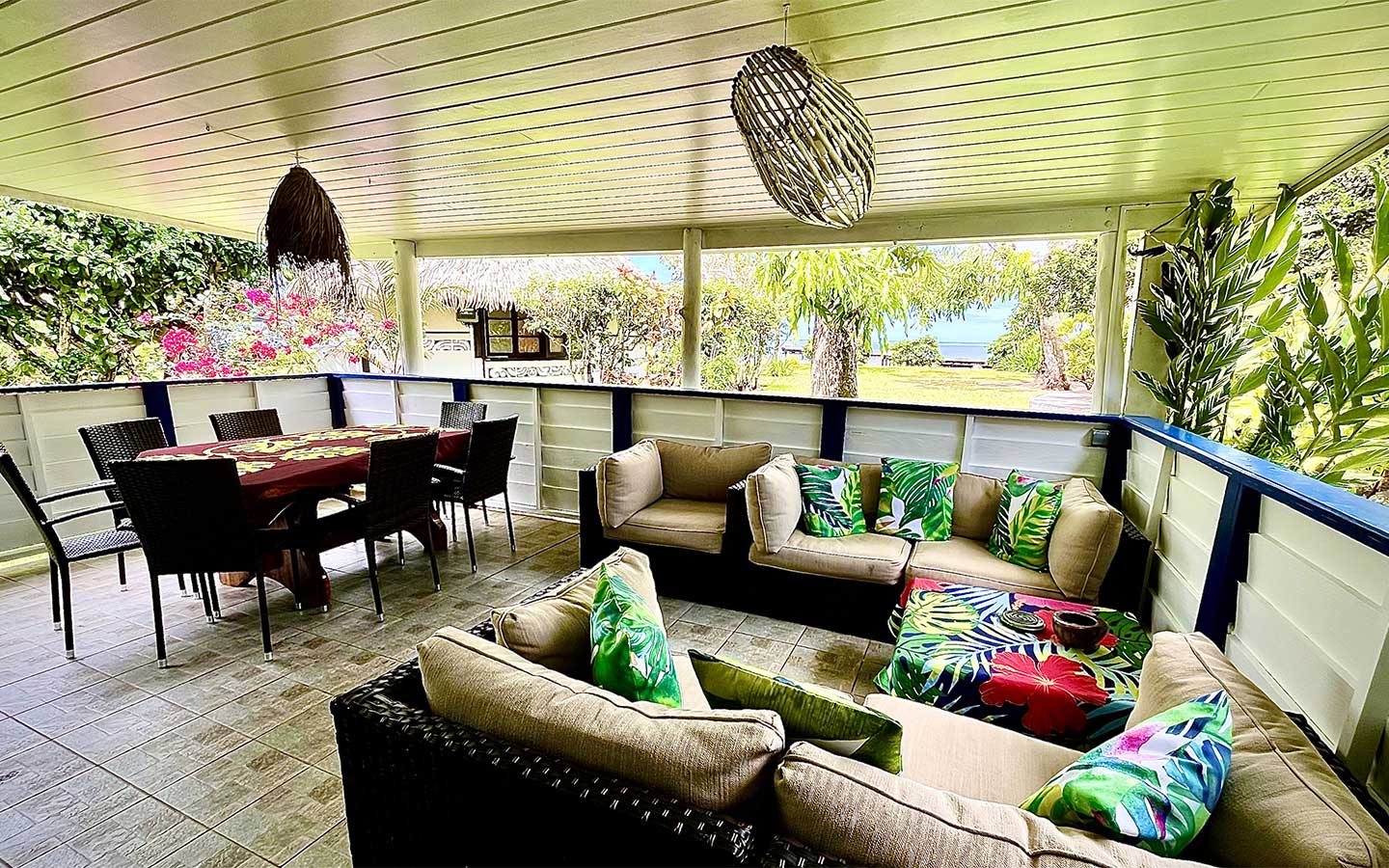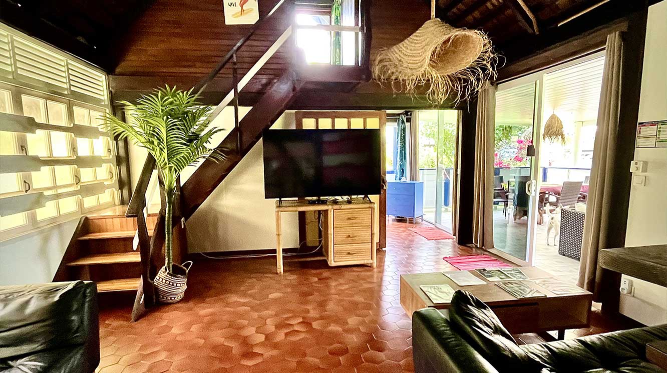 Les baies vitrées coulissantes du salon et de la chambre à coucher s’ouvrent sur une grande terrasse couverte qui fait office de salle à manger. Sa table taillée dans un tronc de falcata en fait son originalité. Un coin repos aménagé par des canapés vous permettra d’y faire votre sieste à l’abri des regards. Le grand manguier devant la terrasse, planté dans les années 60, assure de l’ombre.